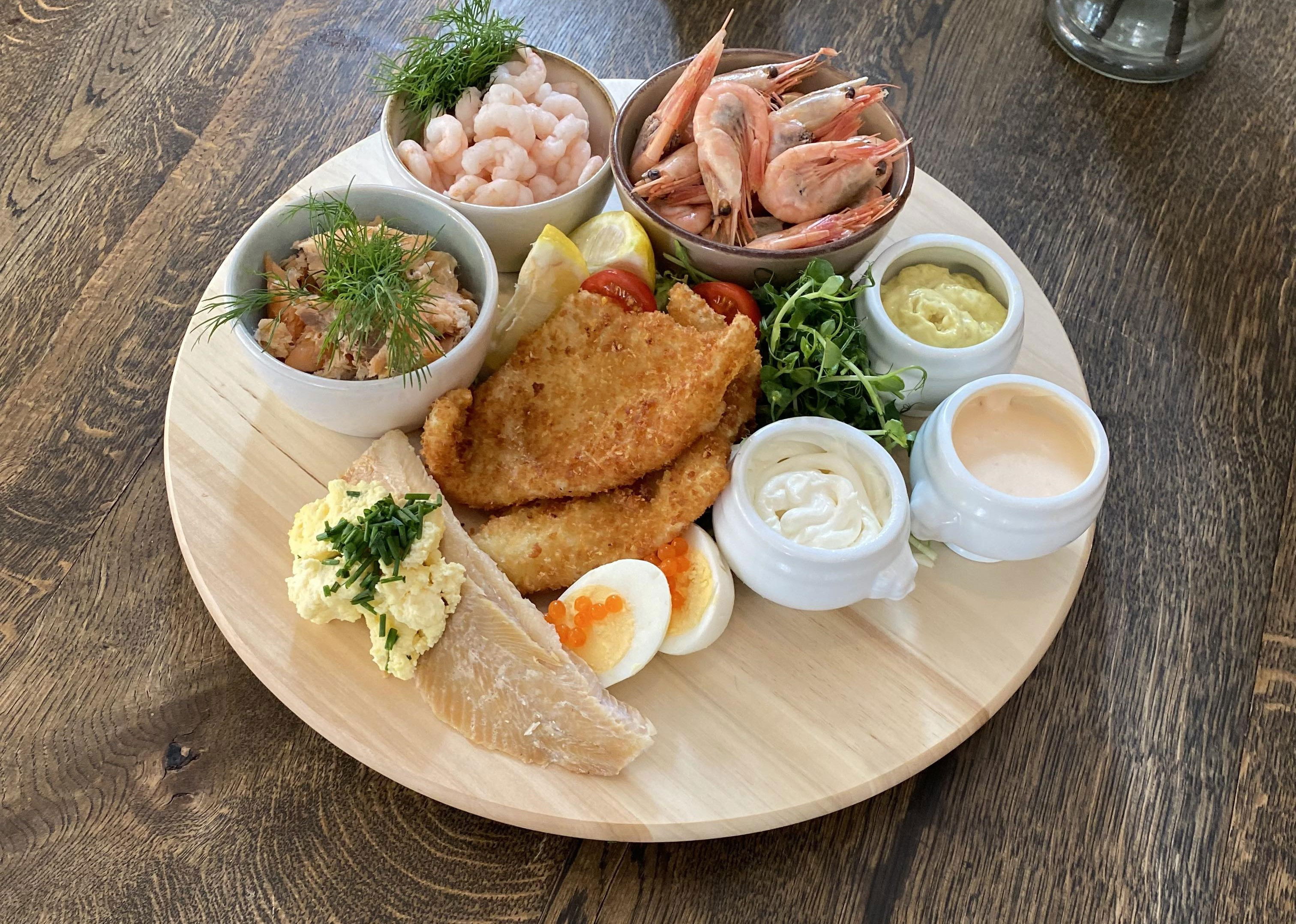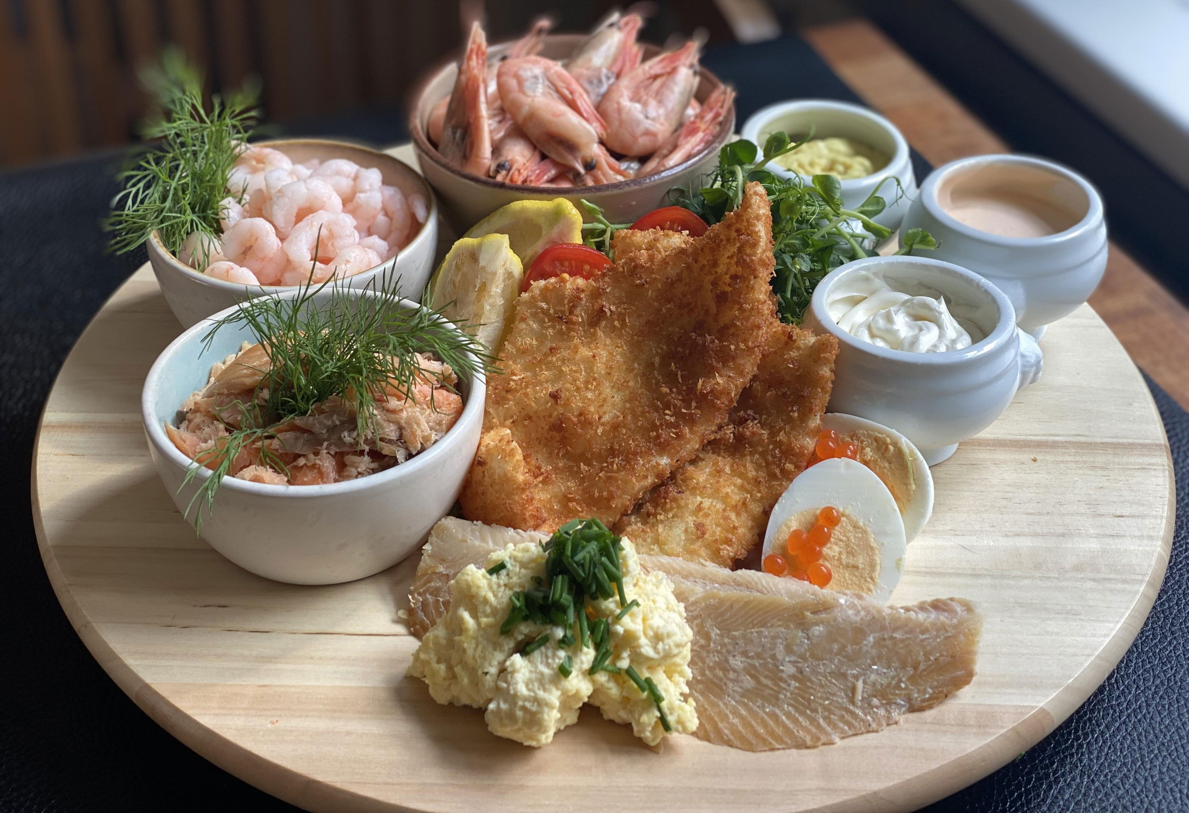 Fiskeplatten bugner af alt det gode fra havet, og I får alt hvad hjertet begærer. Der er både det kolde og det lune i form af rødspættefileter og varmrøget laks, friske pil-selv rejer samt røget ørredfilet med røræg.