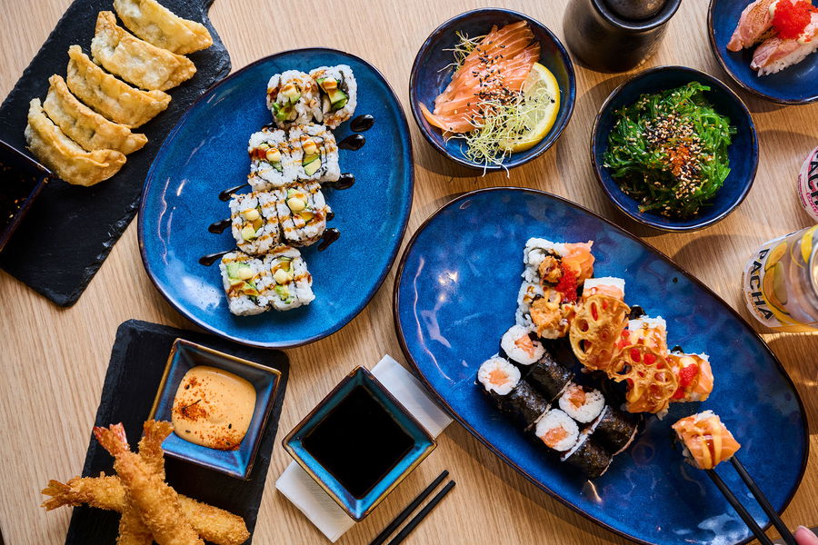 Inkl. startplatte, sushi, dips og forretter som tempurarejer, edamamebønner, dumplings og tangsalat