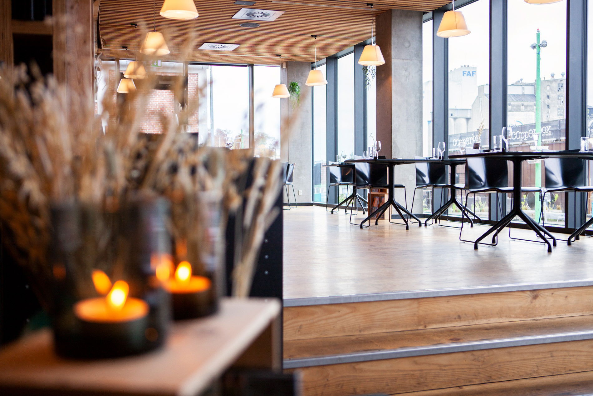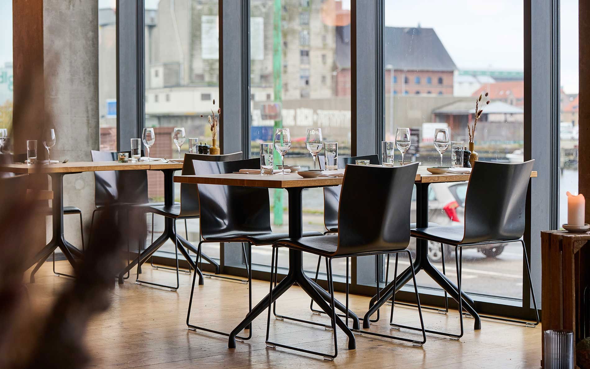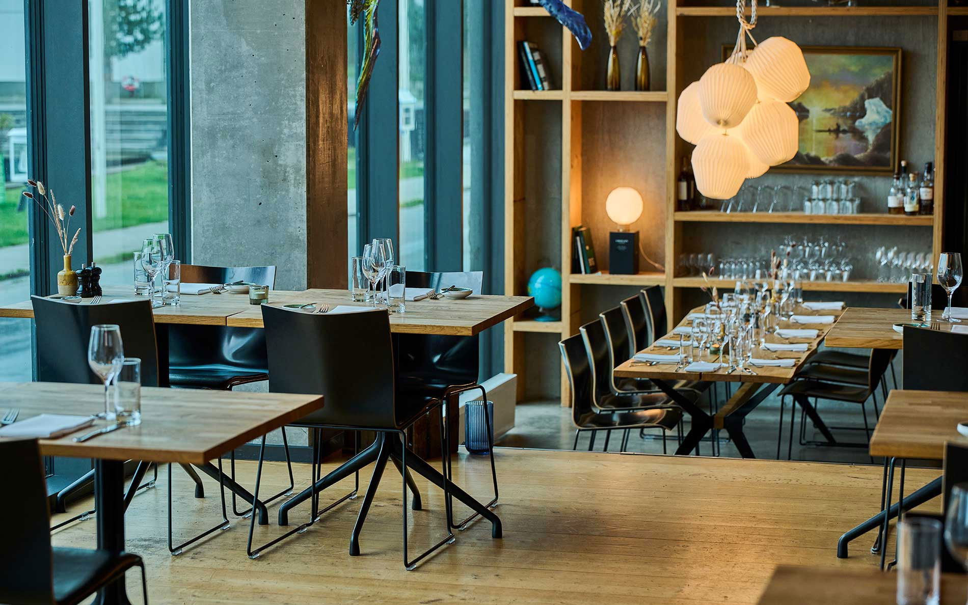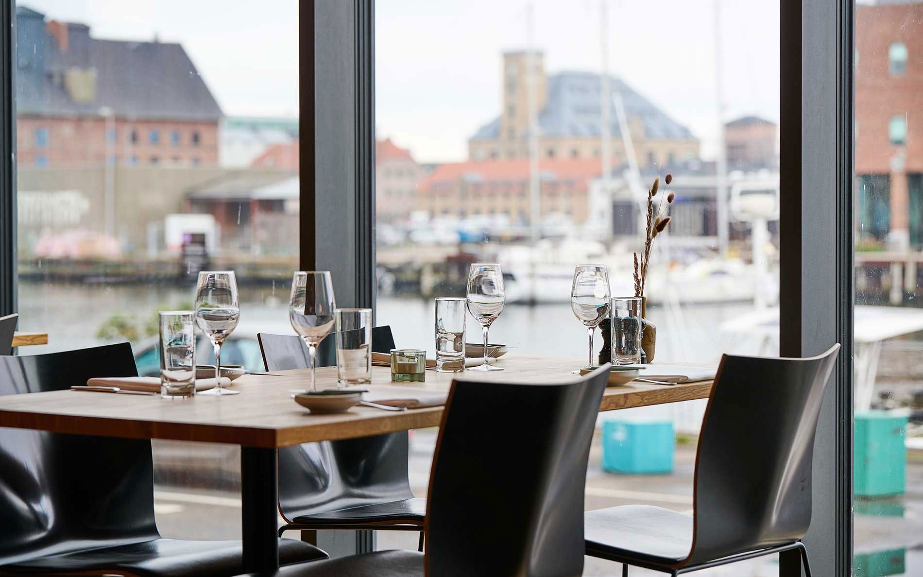 Fra restaurantens lyse lokaler har du første parket til Odenses levende havnefront – hvor moderne arkitektur møder industrihavnen, og Åløkkeskovens grønne trækroner danner en rolig og naturlig baggrund.