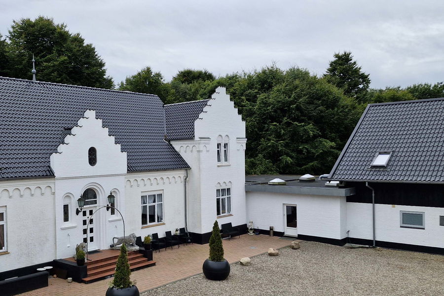 Hovedbygningen præsenterer sig med klassisk herregårdsstil og en placering på en let forhøjning med udsigt over Holsted Å-ådalen og markerne omkring. Fra vinduerne kan man skimte grønne enge, åens bløde forløb og den ro, som præger området. Indenfor byder rummene på højere lofter, store vinduespartier og detaljer, som vidner om stedets alder og karakter – alt sammen med respekt for bygningens oprindelige stil, men med nutidige faciliteter for komfort.