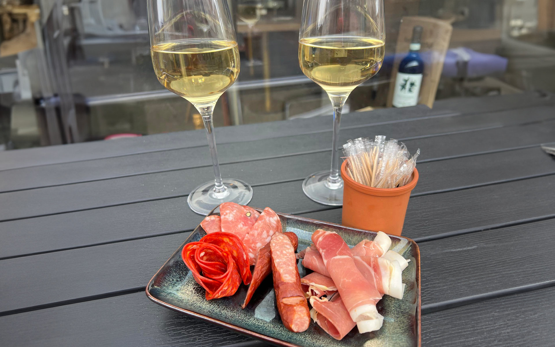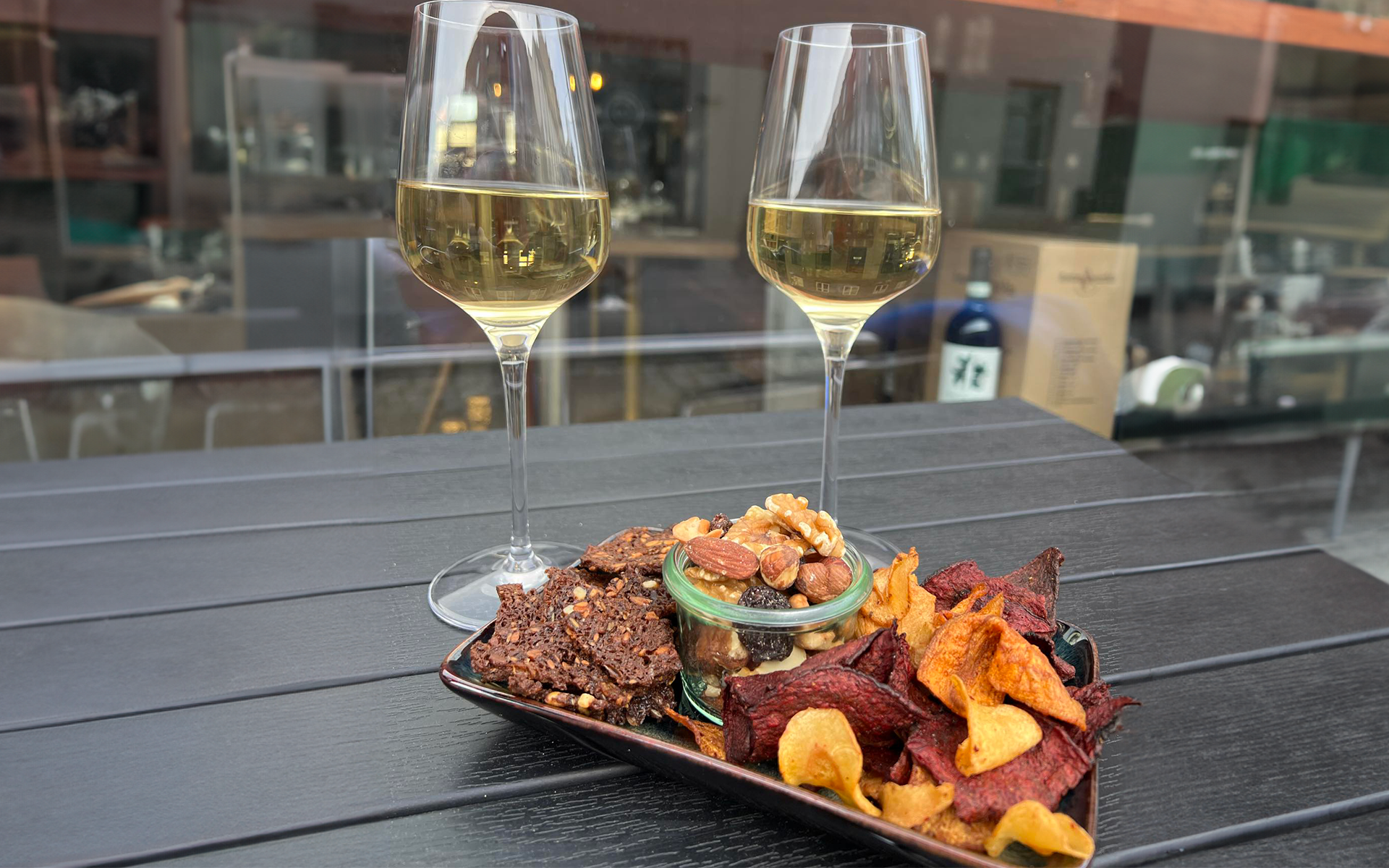 Vælg 2 glas af udvalgte mousserende, hvid, rosé, rød eller portvine og match vinen med en lille platte med ost, pølser, syltede ting eller knas.